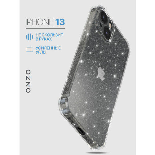 Противоударный чехол для iPhone 13 / Бампер на Айфон 13 с рельефными гранями, прозрачный с блестками