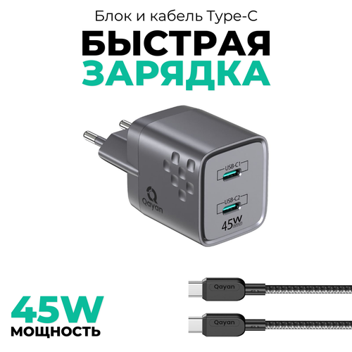 Зарядное устройство для телефона iPhone / Samsung с быстрой зарядкой 45Вт и кабелем Type-C