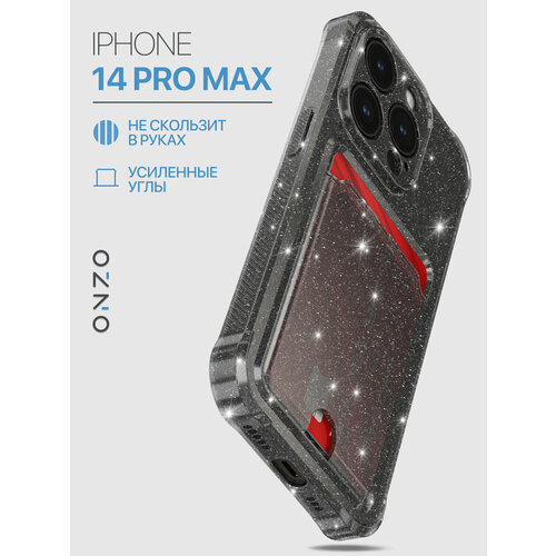 Чехол для iPhone 14 Pro Max с усиленными углами и с карманом для карт / Накладка на Айфон 14 Про Макс темно-прозрачный блестящий
