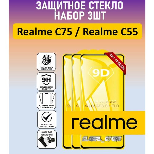 Комплект 3 в 1: Защитное полноэкранное стекло для Realme C75 / Realme C55 ( 3 шт ) Реалми Ц75 / Реалми С55 Full Glue