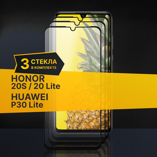 Комплект 3 шт. Противоударное защитное стекло для телефона Huawei P30 Lite, Honor 20S, 20 Lite / Полноклеевое 3D стекло с олеофобным покрытием на смартфон Хуавей П30 Лайт, Хонор 20С, 20 Лайт / С черной рамкой