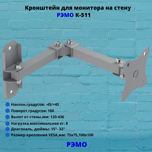 Кронштейн для монитора на стену наклонно-поворотный с диагональю 15"-32" Рэмо К-511, металлик