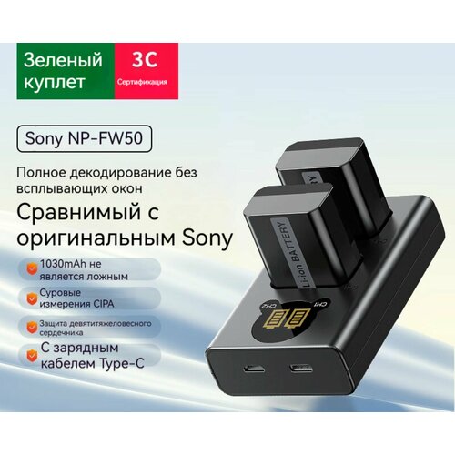 Двойное зарядное устройство для аккумулятора камер Sony NP-FW50 / Alpha a7 с индикатором заряда, USB Type-C, микро USB