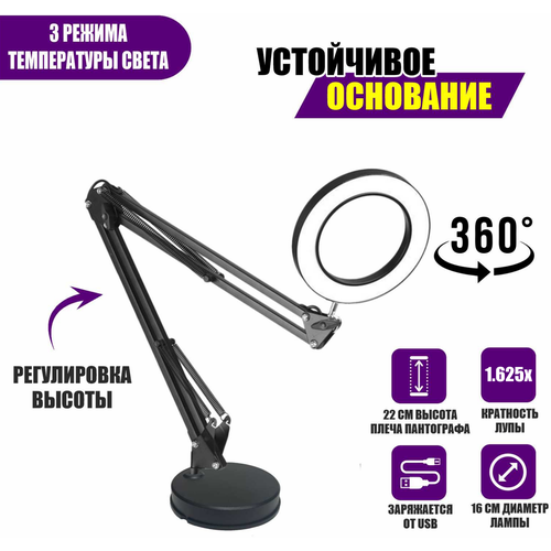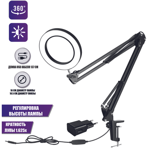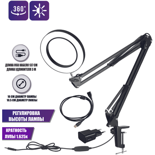 Настольная светодиодная лампа лупа LN-22U30A на усиленной струбцине с доп удлинителем кабеля 3 м и адаптером питания к сети 220В черная