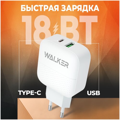 Сетевое зарядное устройство для телефона WALKER WH-37 2 разъема USB и Type-C 18W, быстрая зарядка, блок питания для xiaomi, iphone, на андроид
