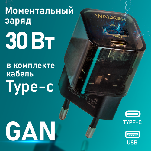 Зарядное устройство для телефона с кабелем Type-C, WALKER, WH-61T, 2 разъема, быстрая Gan зарядка для iphone, xiaomi, Android, блок питания