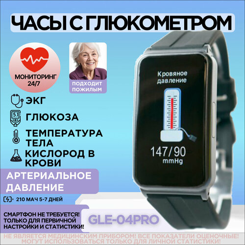 Умные часы с измерением сахара в крови ЭКГ, давления, пульса, температуры, кислорода GLЕ-04 (2023), часы-глюкометр неинвазивный черный