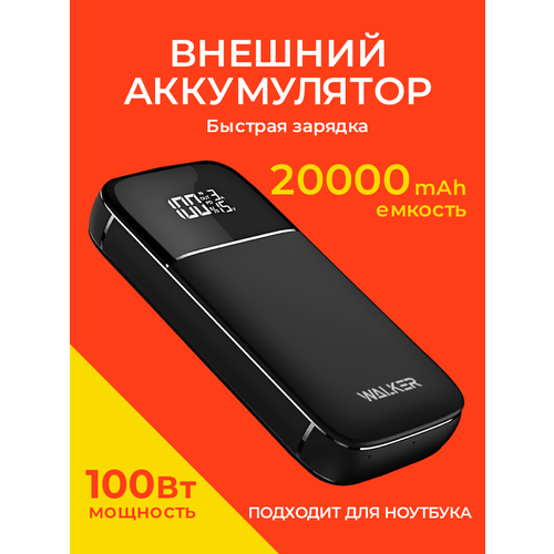 Внешний аккумулятор power bank 20000 mAh, WALKER WB-525, портативная зарядка, повербанк для xiaomi, пауэр банк для redmi, пауэрбанк для iphone, черный
