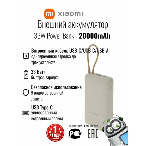 Внешний аккумулятор Xiaomi 33W Power Bank 20000mAh, Tan, Ростест (BHR8851GL) бежевый