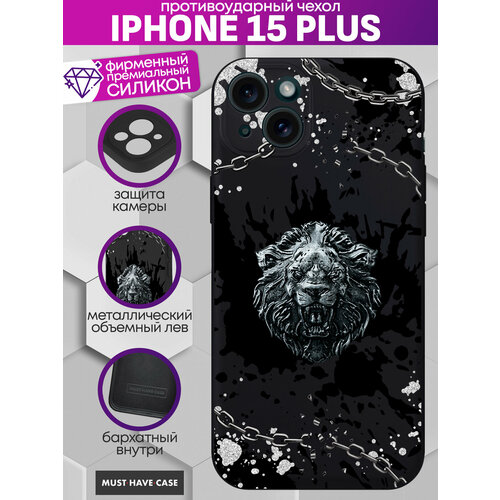 Чехол на IPhone 15 Plus Премиум с Серебристым металлическим львом и цепями