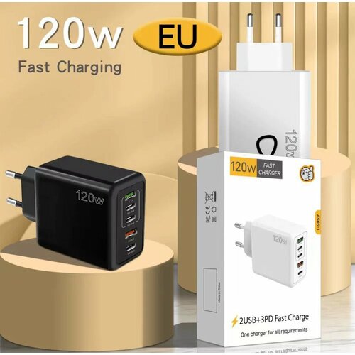 Мощное зарядное устройство 220/5/120 Ват для смартфонов, планшетов, ноутбука USB-2, typе-с-3, 5 в 1 Черный