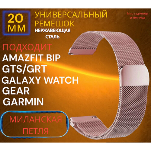 Металлический магнитный ремешок 20 мм Миланская петля серебро для Amazfit Bip /GTR / GTS / Galaxy Watch / Gear / Huawei / Honor / Garmin/розовое-золото
