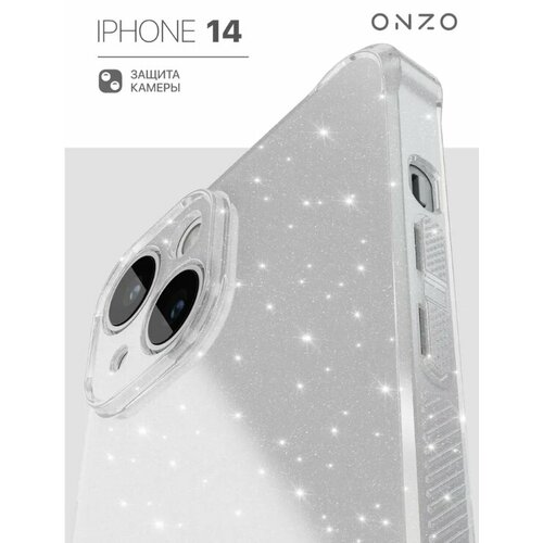 Чехол для iPhone 14 с усиленными углами / Бампер на Айфон 14 белый с серебристыми блестками