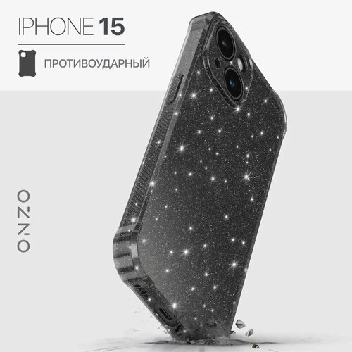 Блестящий чехол для iPhone 15 / Айфон 15 с рельефными гранями, темно-прозрачный