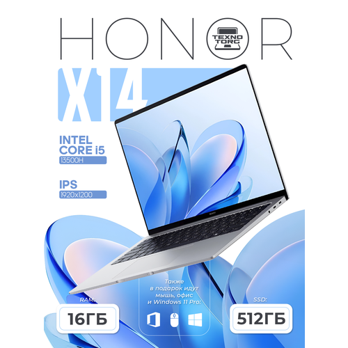 Ноутбук HONOR MagicBook X 14 (Core i5-13500H/14"/1920x1200/16 Гб/512gb SSD/Iris Xe Graphics/Win 11Pro+office)серебристый