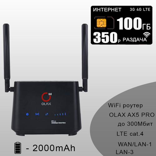 Комплект для интернета и раздачи, 100ГБ за 350р/мес, Wi-Fi роутер OLAX AX5 PRO + сим карта