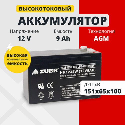 Аккумулятор для ибп 12v 9Ah ZUBR F2 акб для детского электромобиля, мотоцикла, машинки, эхолота, инвалидной коляски, кассы, сигнализации, освещения