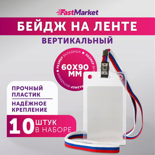 Бейдж на ленте вертикальный FastMarket, чехол для пропуска - 10 шт, цвет триколор