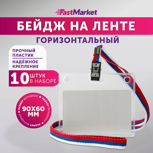 Бейдж на ленте горизонтальный FastMarket, чехол для пропуска - 10 шт, цвет триколор