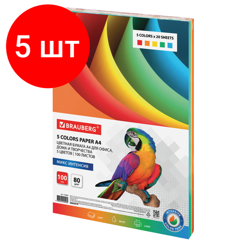 Комплект 5 шт, Бумага цветная BRAUBERG, А4, 80 г/м2, 100 л, (5 цветов х 20 л.), интенсив, для офисной техники, 112461
