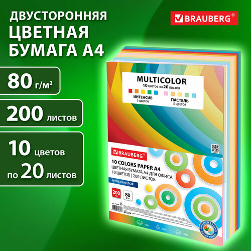 Бумага цветная для принтера офисная 10 цветов Brauberg Multicolor, формат А4, 80 г/м2, 200 листов, (10 цветов x 20 листов), 114209