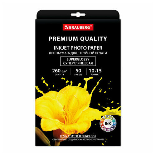 Фотобумага PREMIUM суперглянцевая, 10х15 см, 260 г/м2, односторонняя, 50 листов, BRAUBERG, 363999