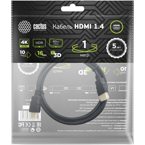 Кабели и шлейфы CACTUS Кабель аудио-видео Cactus CS-HDMI.1.4-1 HDMI (m)/HDMI (m) 1м. Позолоченные контакты