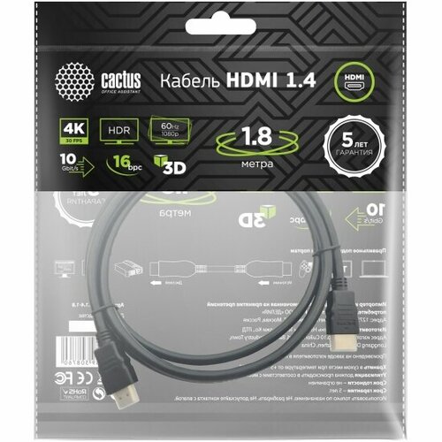 Кабель CACTUS аудио-видео CS-HDMI.1.4-1.8 HDMI (m)/HDMI (m) 1.8м. Позолоченные контакты