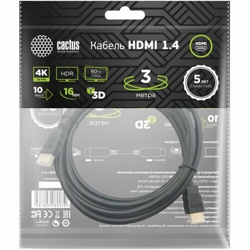 Кабель CACTUS аудио-видео CS-HDMI.1.4-3 HDMI (m)/HDMI (m) 3м. Позолоченные контакты