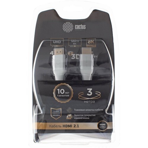 Кабели и шлейфы CACTUS Кабель аудио-видео Cactus CS-HDMI.2.1-3 HDMI (m)/HDMI (m) 3м. Позолоченные контакты серебристый