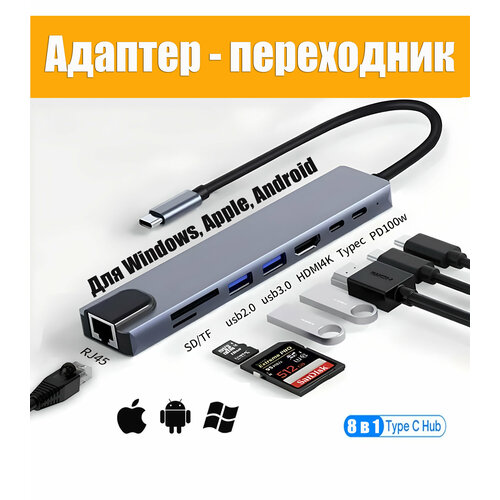 Переходник для MacBook и Iphone 15 Type-C на HDMI разветвитель usb + HDMI 8 в 1