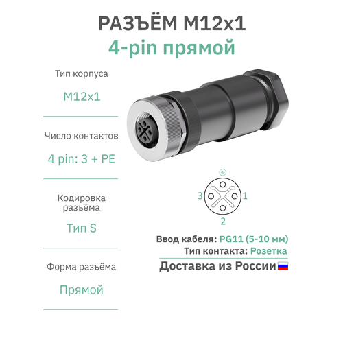 Разъём M12 S-coding 4 pin: 3 + PE прямой / розетка (мама) / PG11 (5-10 мм диаметр под кабель) / модель RAZM-F12-C4-CODE-S-PG11
