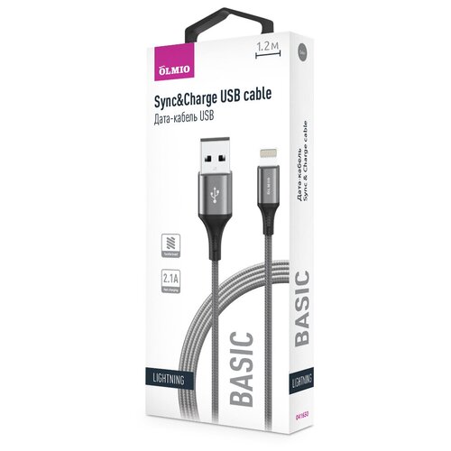 Кабель USB 2.0 - Lightning (1,2м) 2.1A, текстильная оплетка, BASIC, OLMIO 041650