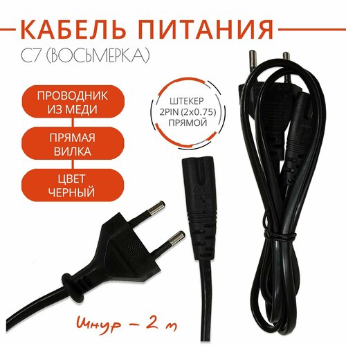 Кабель питания C7 (восьмерка), прямой разъем 2x0.75mm, длина шнура 2 метра