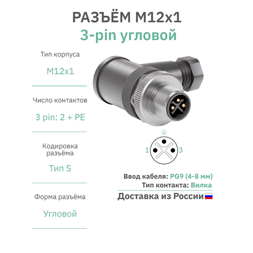 Разъём M12 S-coding 3 pin: 2 + PE угловой / вилка (папа) / PG9 (4-8 мм диаметр под кабель) / модель RAZM-M12-C3A-CODE-S-PG9
