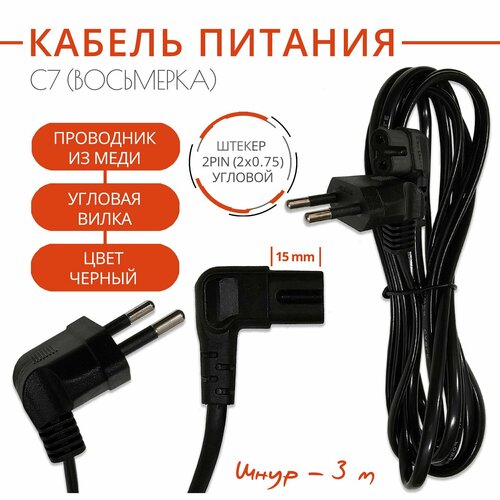 Кабель питания C7 (восьмерка), угловой разъем угловая вилка, 2x0.75mm, длина шнура 3 метра