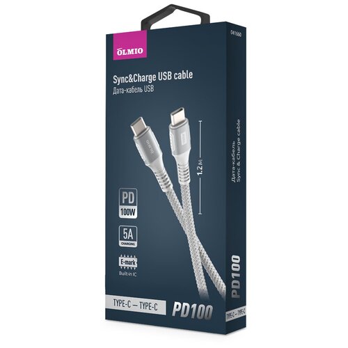 Кабель PD100 Type-C - Type-C, 1.2м, PD 100W, 5A, тканевая оплетка, Olmio