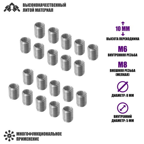 Резьбовая гайка переходник с внешней резьбой М8 и внутренней резьбой М6, высота 10 мм, 20 шт