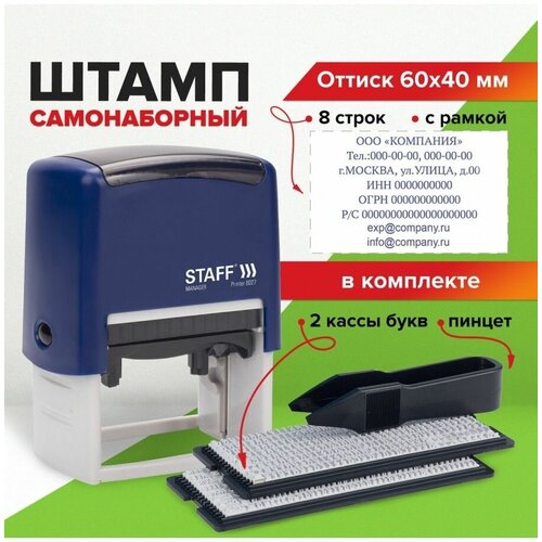 Штамп самонаборный 8-строчный STAFF, комплект 5 шт, оттиск 60х40 мм, "Printer 8027", кассы В комплекте, 237430