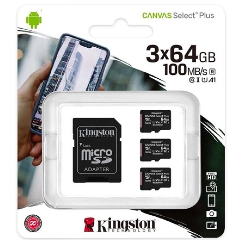 Карта памяти Kingston Canvas Select Plus microSDXC, 3 шт, SDCS2/64GB-3P1A