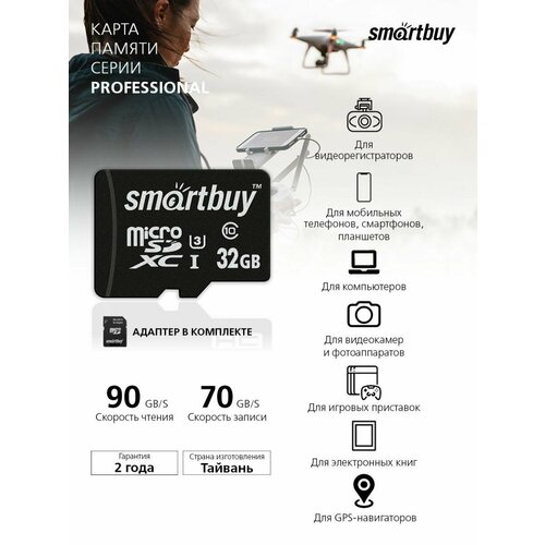 Карта памяти SmartBuy microSDHC 32 ГБ Class 10, V30, UHS-I U3, R/W 90/55 МБ/с, адаптер на SD, RU, 1 шт., разноцветный
