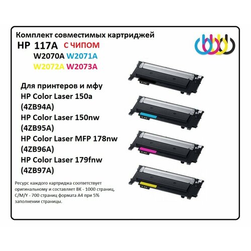 Комплект совместимых картриджей HP 117A, HP W2070A Black, HP W2071A Cyan, HP W2072A Yellow, HP W2073A Magenta, С чипом
