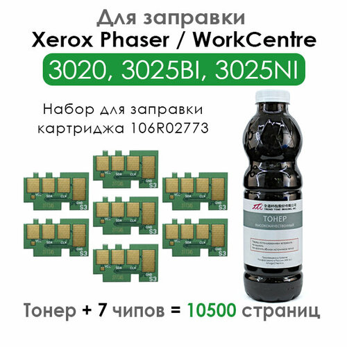 Комплект для заправки картриджей Xerox Phaser 3020, WorkCentre 3025BI, 3025NI (106R02773), черный Black, 10500 стр, набор 7 чипов + тонер 450 гр