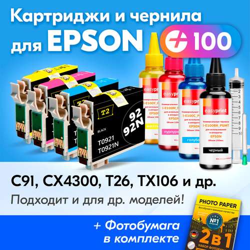 Картриджи для Epson T0921, T0922, T0923, T0924, Epson C91, CX4300, T26, TX106, TX109, TX117, TX119 и др. с чернилами Черный, Голубой, Пурпурный, Желтый новые заправляемые, 4 шт.