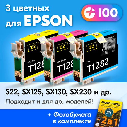 Картриджи Epson T1282, T1283, T1284, для Epson Stylus Photo S22, SX125, SX130, SX230 , SX420W, SX425W и др. с чернилами голубой, пурпурный, желтый новые заправляемые, 3 шт.