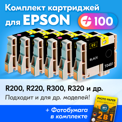 Картриджи для Epson T0481-T0486, Epson Stylus Photo R200, R220, R300, RX600, R340 и др, с чернилами, для струйного принтера, Черный, Голубой, Пурпурный, Желтый, Св.-голубой, Св.-пурпурный, увеличенный объем, заправляемые 6 шт.~Картриджи для Epson T0921, Epson C91, CX4300, T26, TX106, TX109, TX117, TX119 и др. с чернилами черные новые заправляемые, 2 шт.