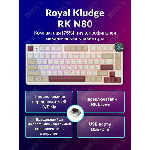 Беспроводная низкопрофильная механическая клавиатура Royal Kludge RK N80 (75%) цвет Rosy Clouds, RGB, Hot Swap, кейкапы с подсветкой символов EN, тактильные свитчи (Low-Profile RK Brown)