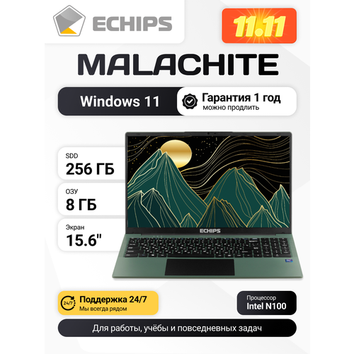 Echips Malachite Ноутбук для работы и учебы 15.6", Intel Processor N100, RAM 8 ГБ, SSD 256 ГБ, Intel UHD Graphics, Windows Home, Русская раскладка