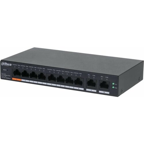 DAHUA DH-CS4010-8ET-60 8-портовый PoE коммутатор с функцией облачного управления L2, 8xRJ45 100Mb PoE, 2xRJ45 1Gb (uplink), суммарно 60Вт, коммутация 4.8 Гб, MAC-таблица 8К, металл