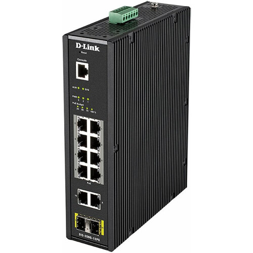 DIS-200G-12PS/A2A Промышленный управляемый L2 коммутатор с 10 портами 10/100/1000Base-T и 2 портами 1000Base-X SFP (8 портов PoE 802.3af/at, PoE-бюдже